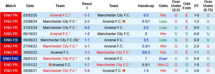 Thành tích đối đầu Arsenal vs Man City