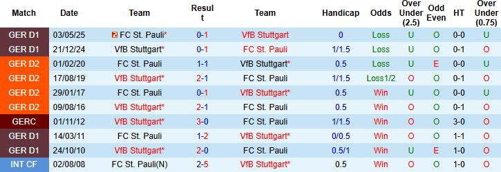 Liên tiếp 2 trận sân nhà gần đây, Stuttgart toàn thắng.  11 lần đụng độ St Pauli gần nhất, cũng có tới 9 lần AB Stuttgart ca khúc khải hoàn. Những con số thống kê này phản ánh sự chênh lệch về thực lực giữa 2 đội, đồng thời là cơ sở để giới túc cầu đặt niềm tin vào Stuttgart ở hạng mục Châu Á.